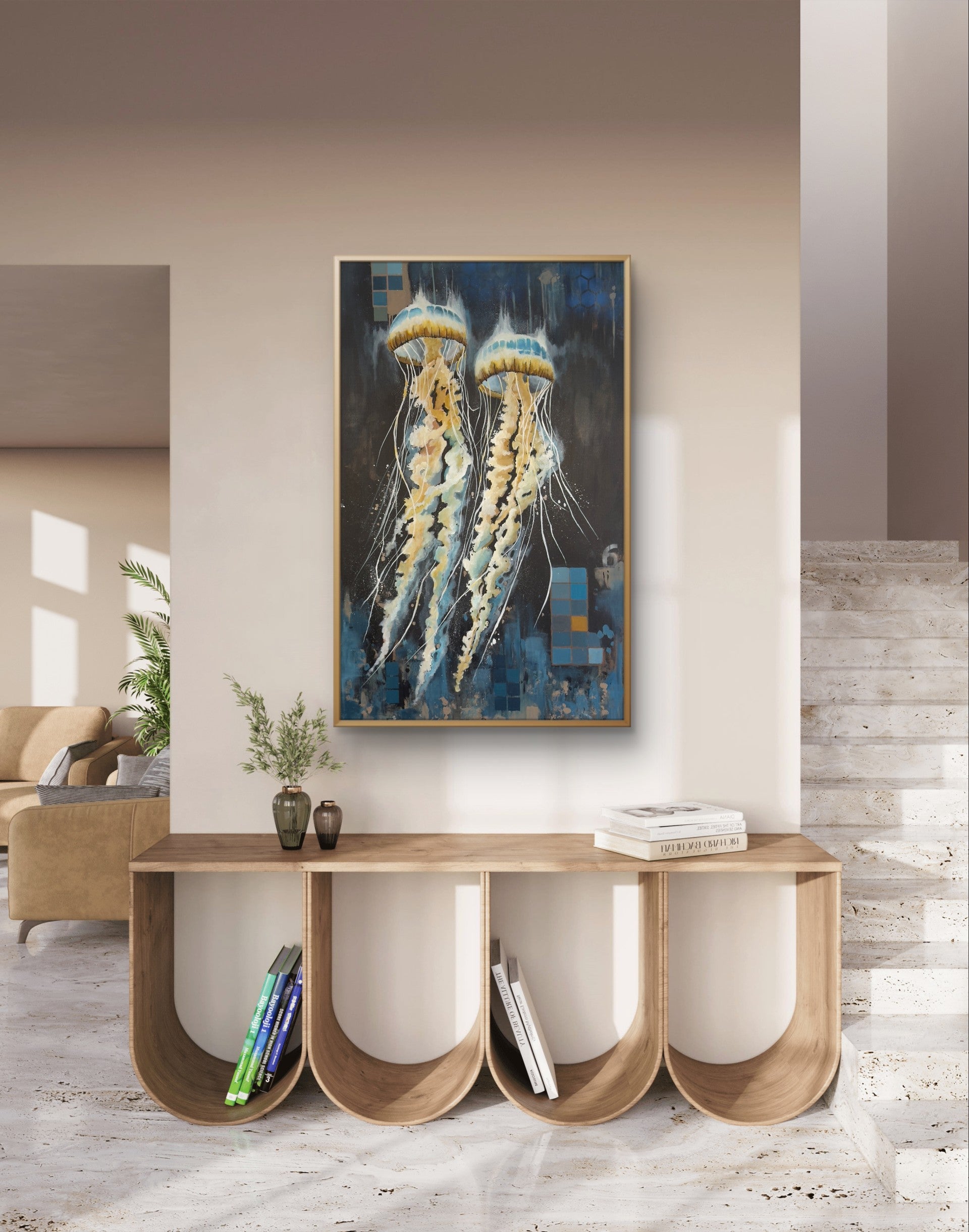 Electric Drift captures the surreal movement of two jellyfish suspended in a dreamlike ocean current. Geometric elements and urban textures in the background hint at a fusion of nature and digital decay.