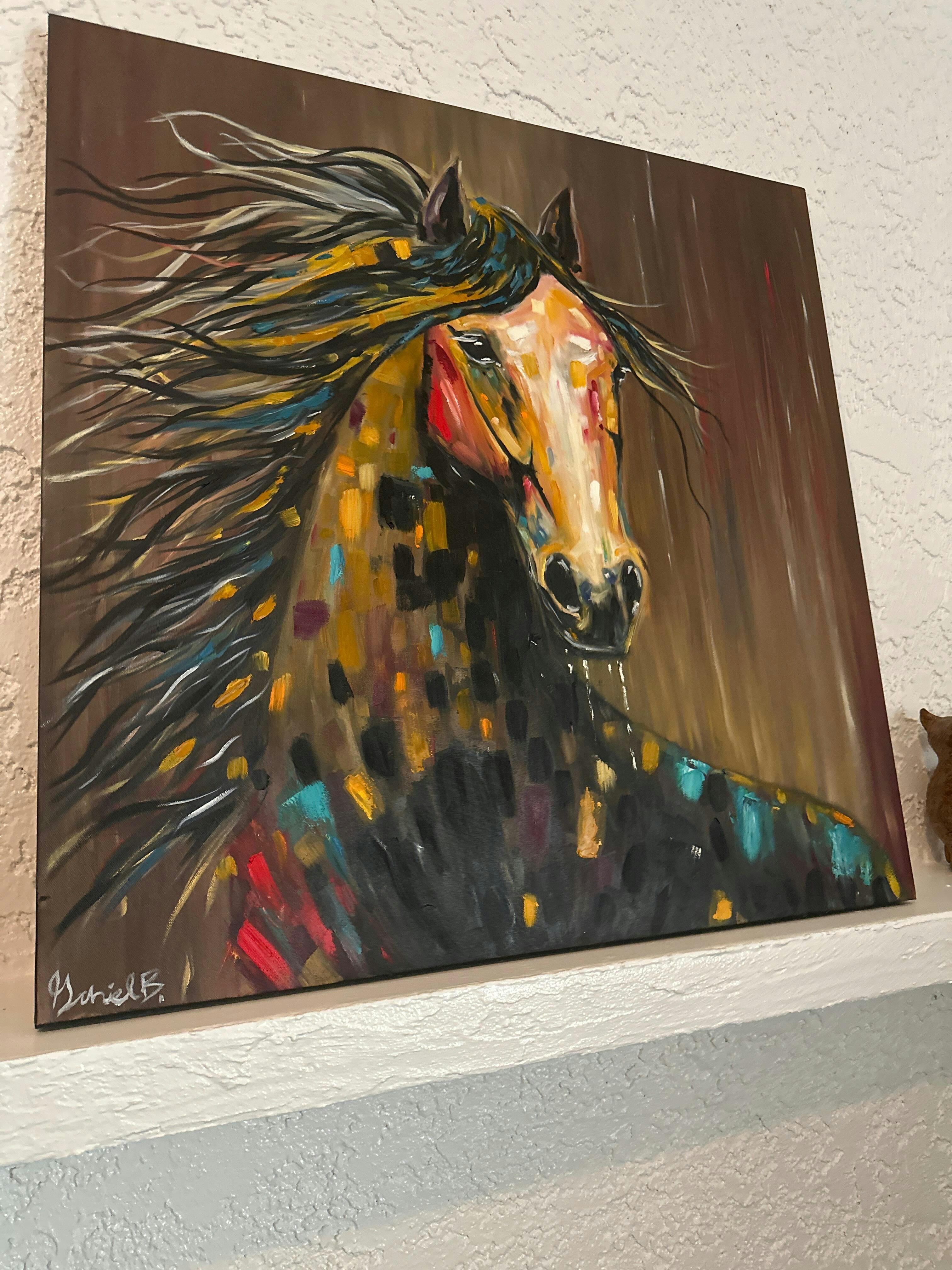 I was at my neighbors who happened to be Gabriel’ s mom and became obsessed with a painting of a wild horse on her fireplace mantel. I could not stop looking at it. I ask my neighbor how I could get my own painting. She made contact with her son and soon I had my own version of that gorgeous horse. I am so happy I get to see that painting everyday!