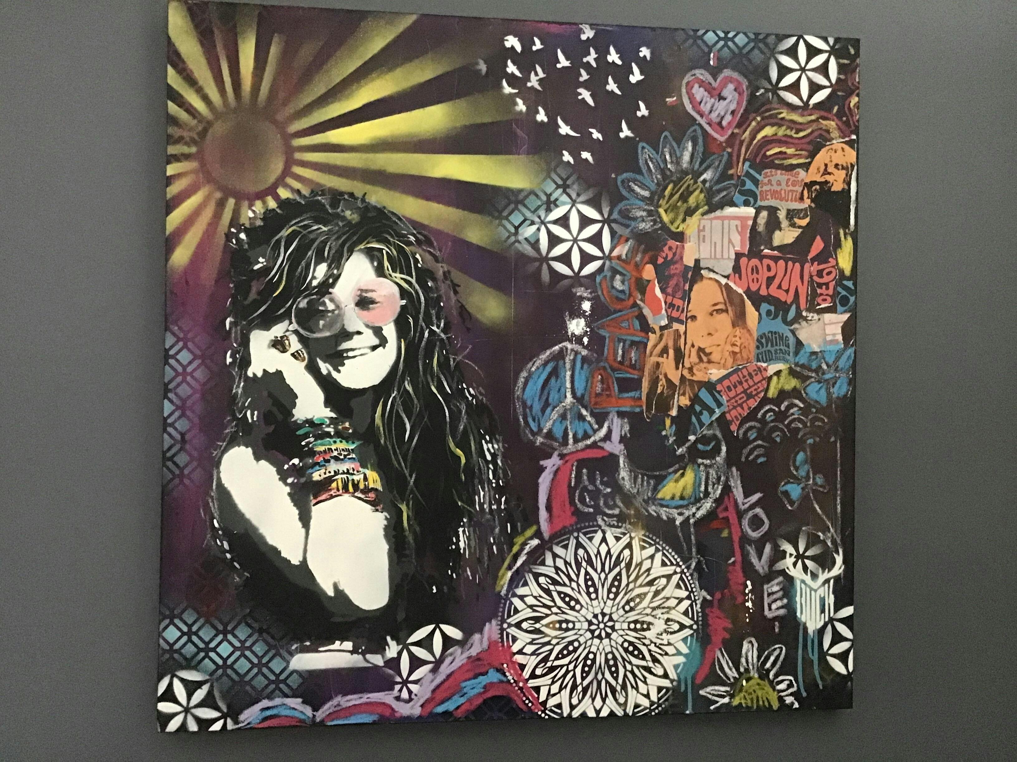 I had the opportunity to view Gabriel Buck’s art work and was impressed with his contemporary themes of street art and original, unique portraits of iconic rock/pop music legends. I commissioned Gabe to paint a portrait of my favorite music artist and was very pleased with the result. I asked that he incorporate color schemes from my favorite album covers of the artist, otherwise, I let his creative imagination deliver the finished product. I am very happy to display his artwork in my home! I was concerned as the painting needed to be shipped across country, but I worried needlessly as Gabe handled everything and the painting arrived in mint condition.