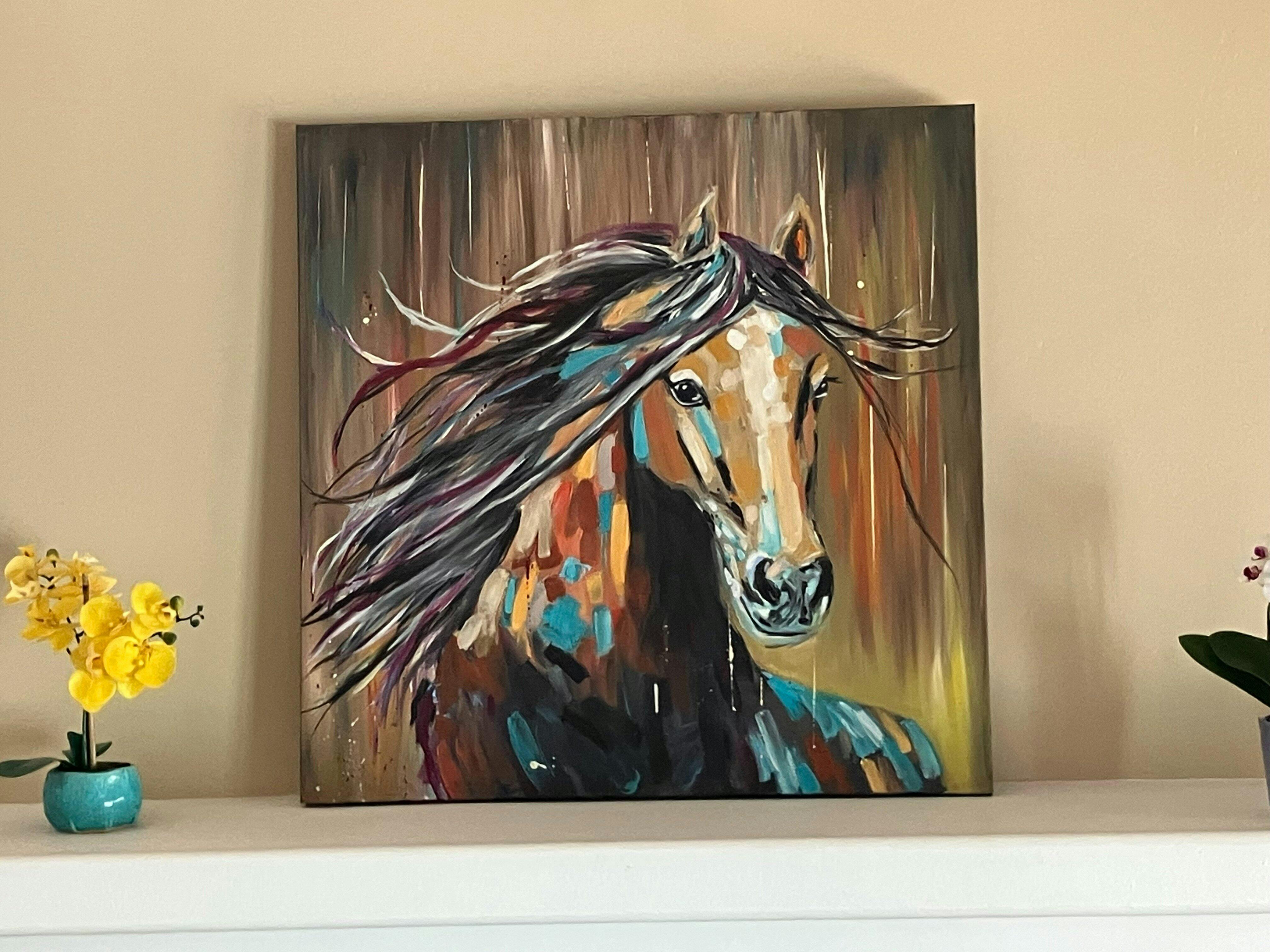 When we commissioned our painting, we asked for a color scheme to accent our living area and our desert Southwest vibe. We could not have been more satisfied with the final result. Having been a horseman in my early life, I can see from the look in his eyes that he has spirit and an "I dare you to try" attitude!