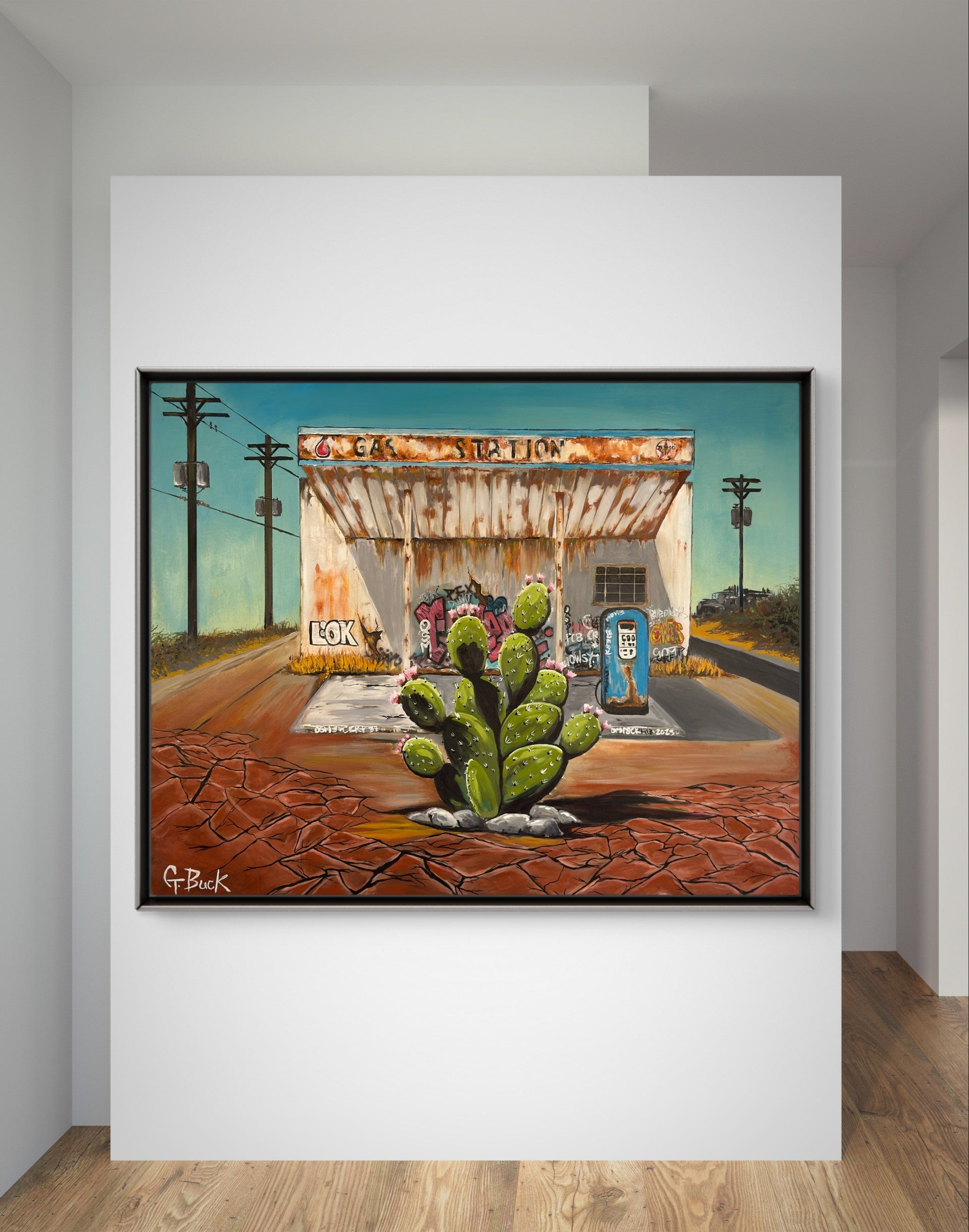 An abandoned gas station, rusted and graffiti-tattooed, sits beneath a pale turquoise sky. Cracked red clay stretches across the foreground, leading the eye to a bold, blooming prickly pear cactus—a symbol of survival and grit in an otherwise desolate landscape.