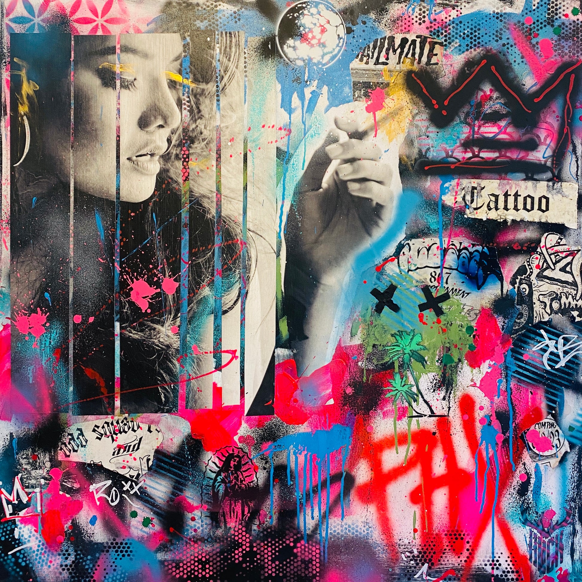Medium: Mixed media on canvas (spray paint, acrylic, collage, stencils)