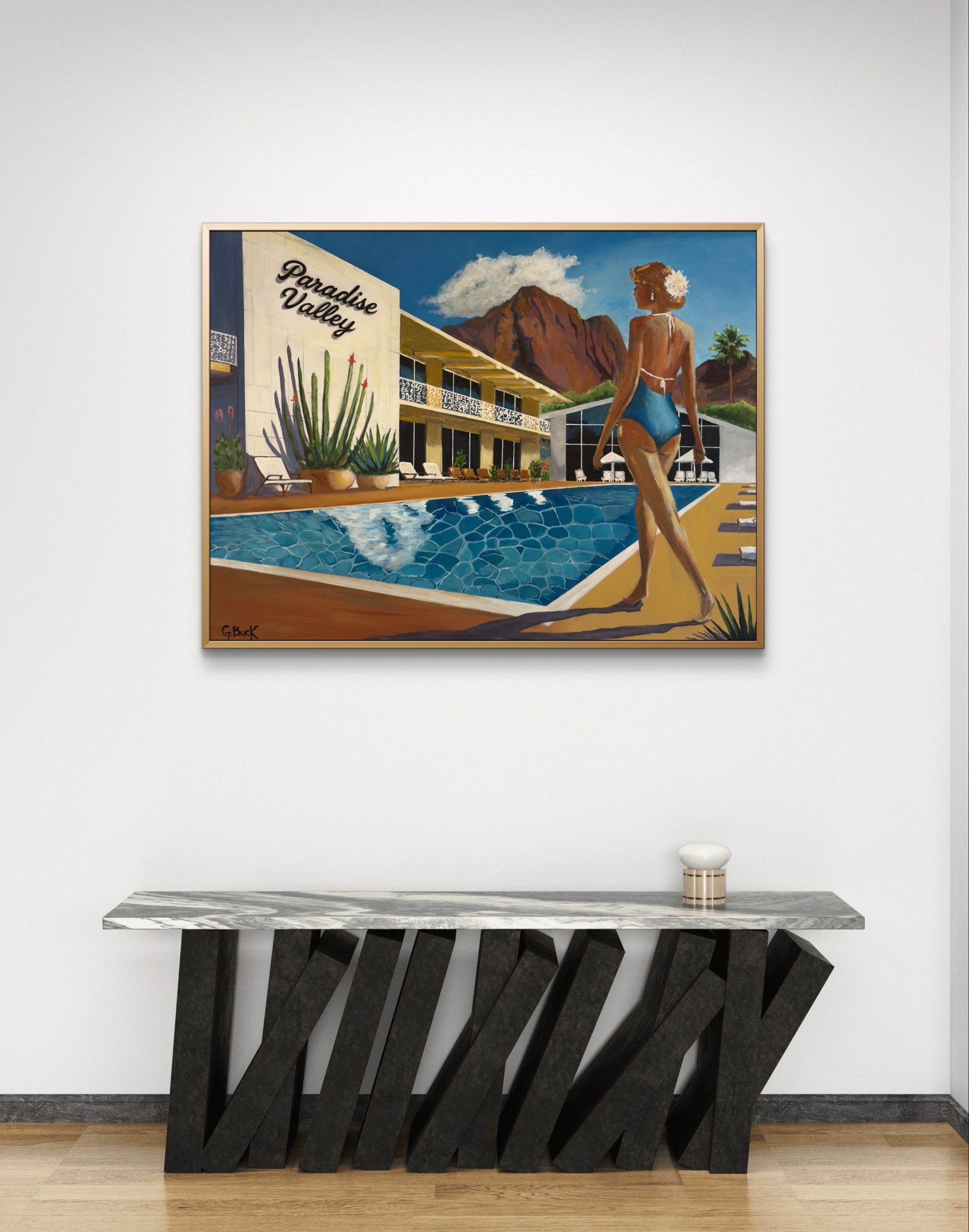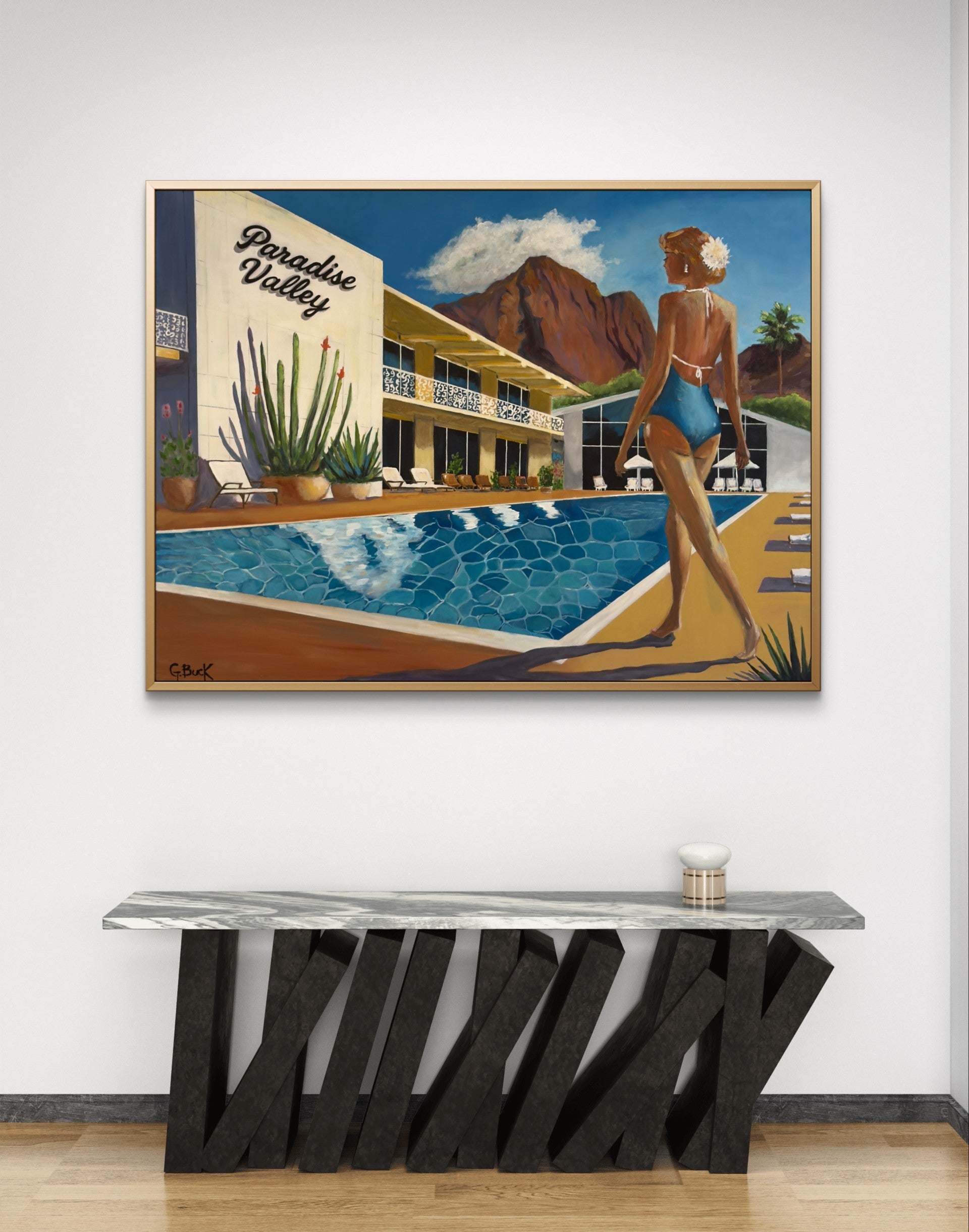 Inspired by the legendary Marriott Mountain Shadows resort in Paradise Valley, Arizona, this piece captures the essence of a bygone era when Hollywood stars escaped to the desert to sip cocktails poolside and bask in the dramatic beauty of mountain views. "Vintage Paradise" channels timeless glamour, blending elegance, nostalgia, and tranquility in a sun-soaked setting.